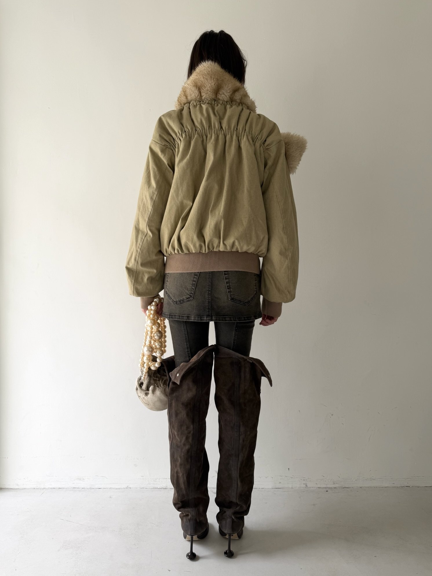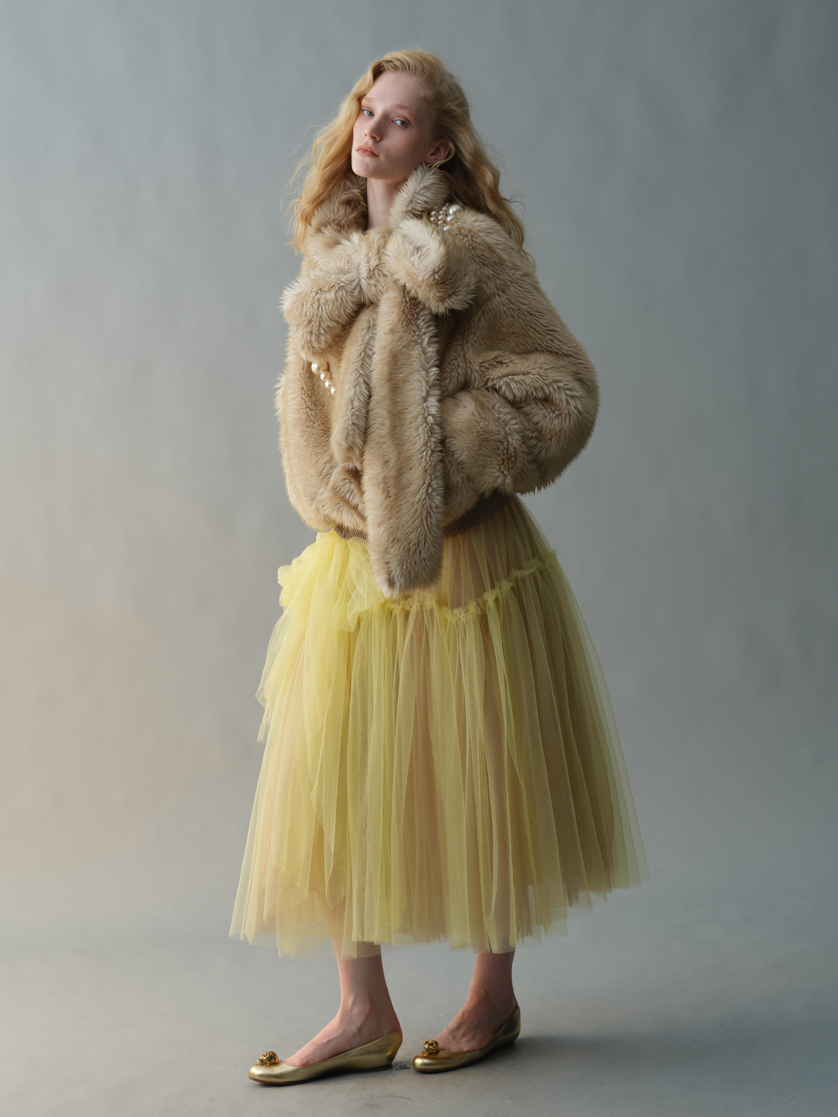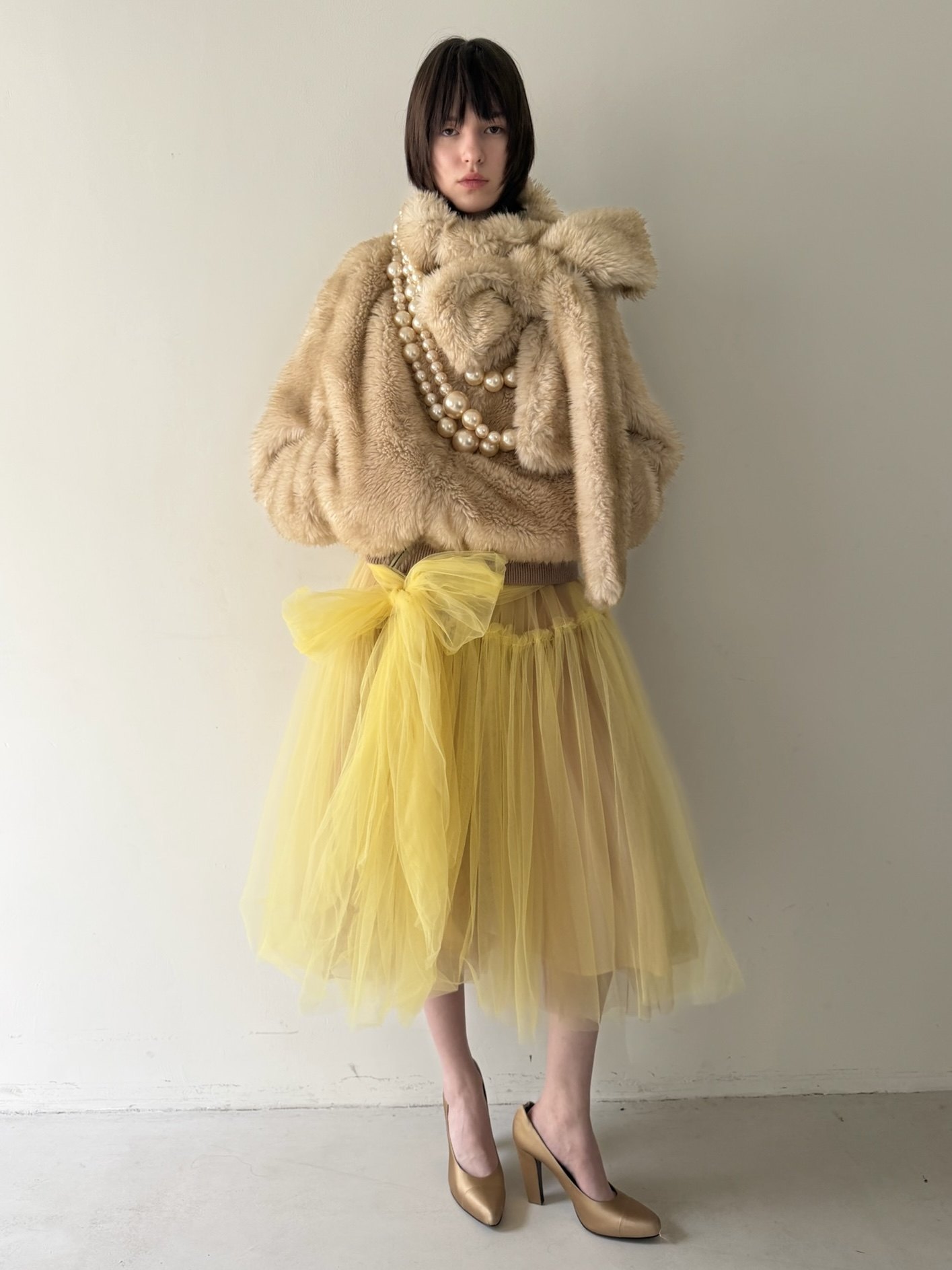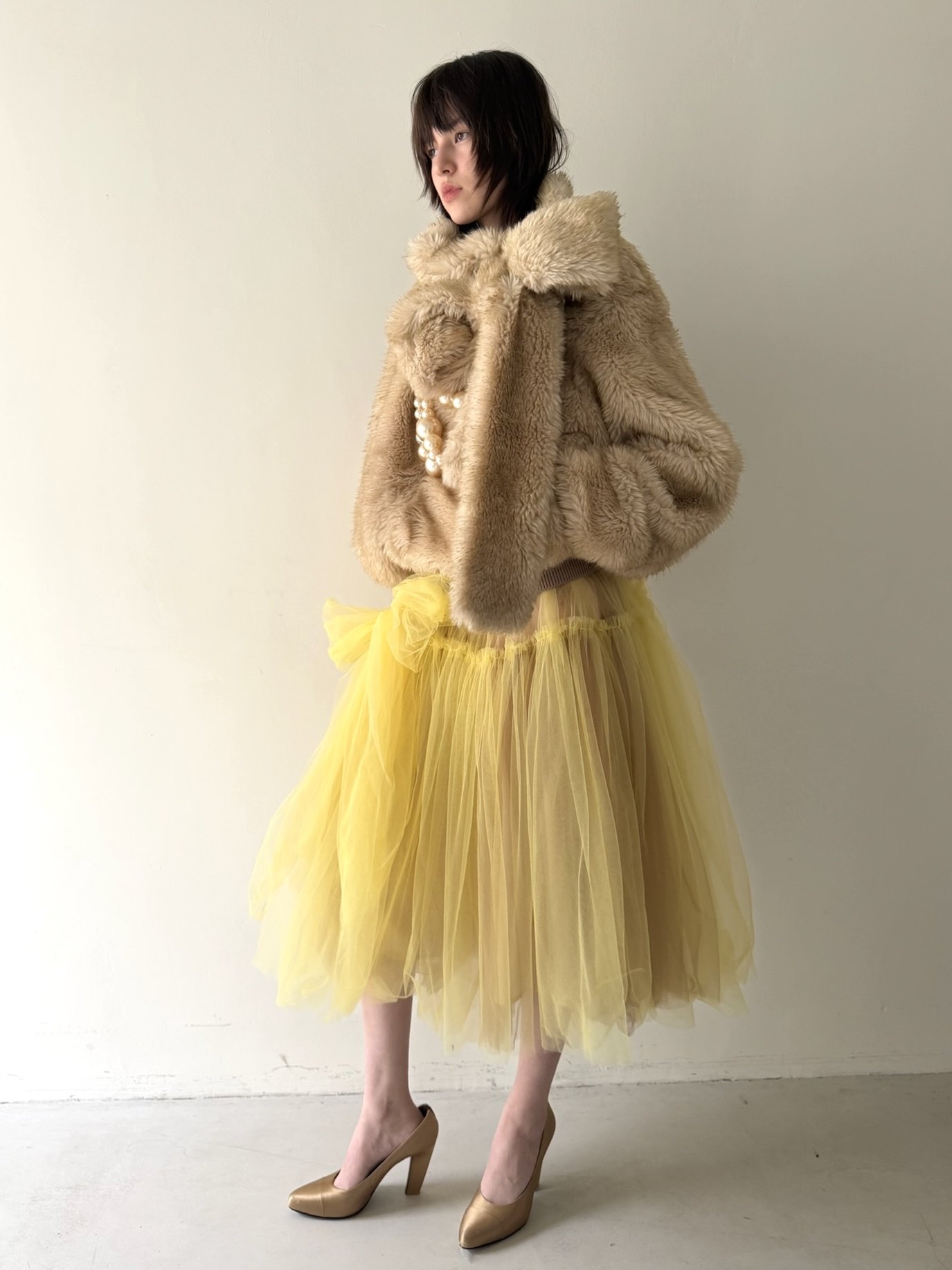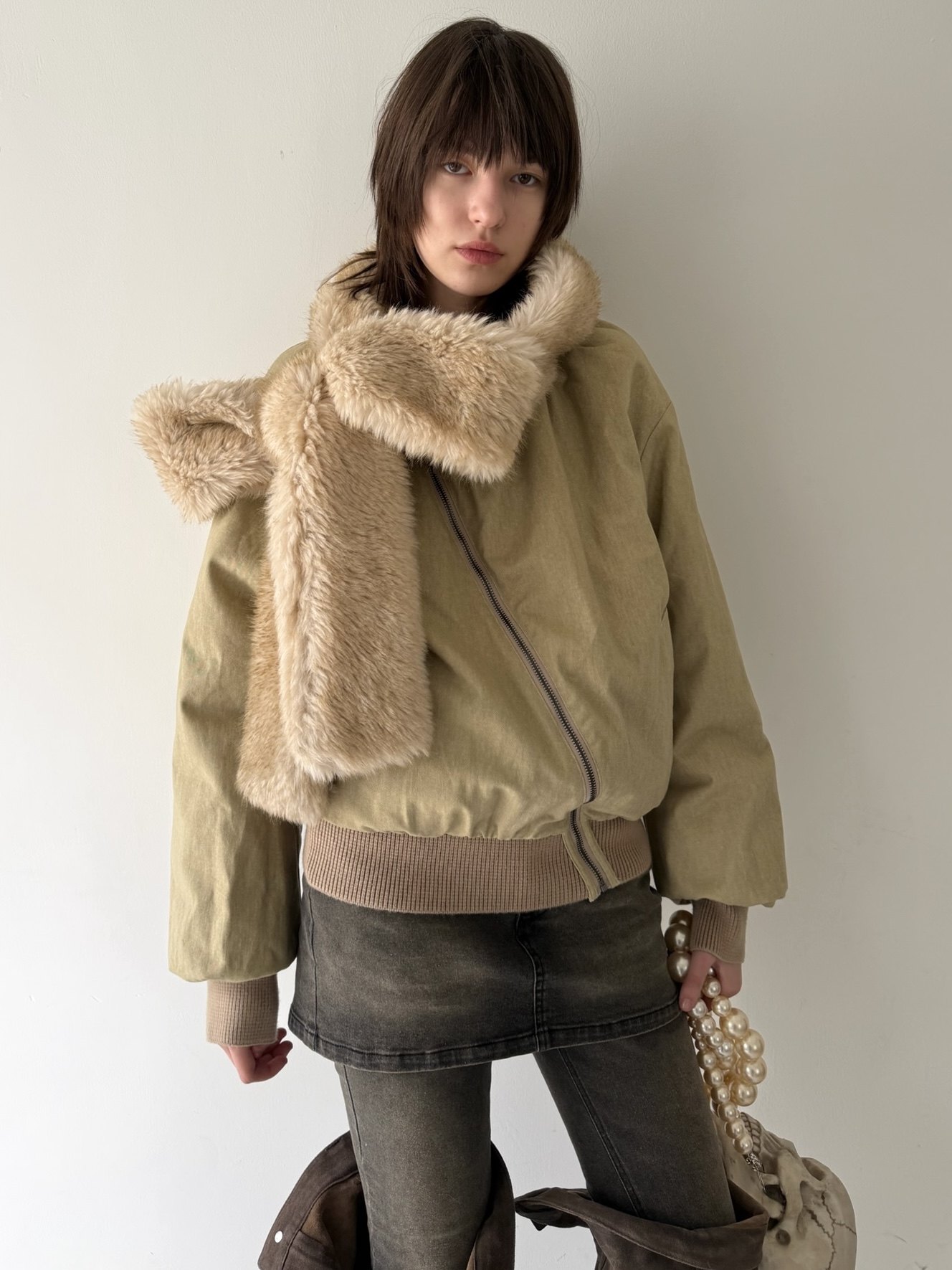 Beige Reversible Faux Fur Jacket With Vintage Cotton Lining And Bow Tie Neck——Fabric: 100% Polyester Lining: 100% Cotton