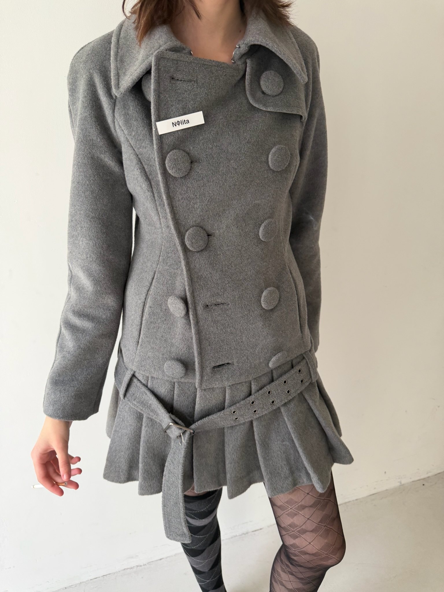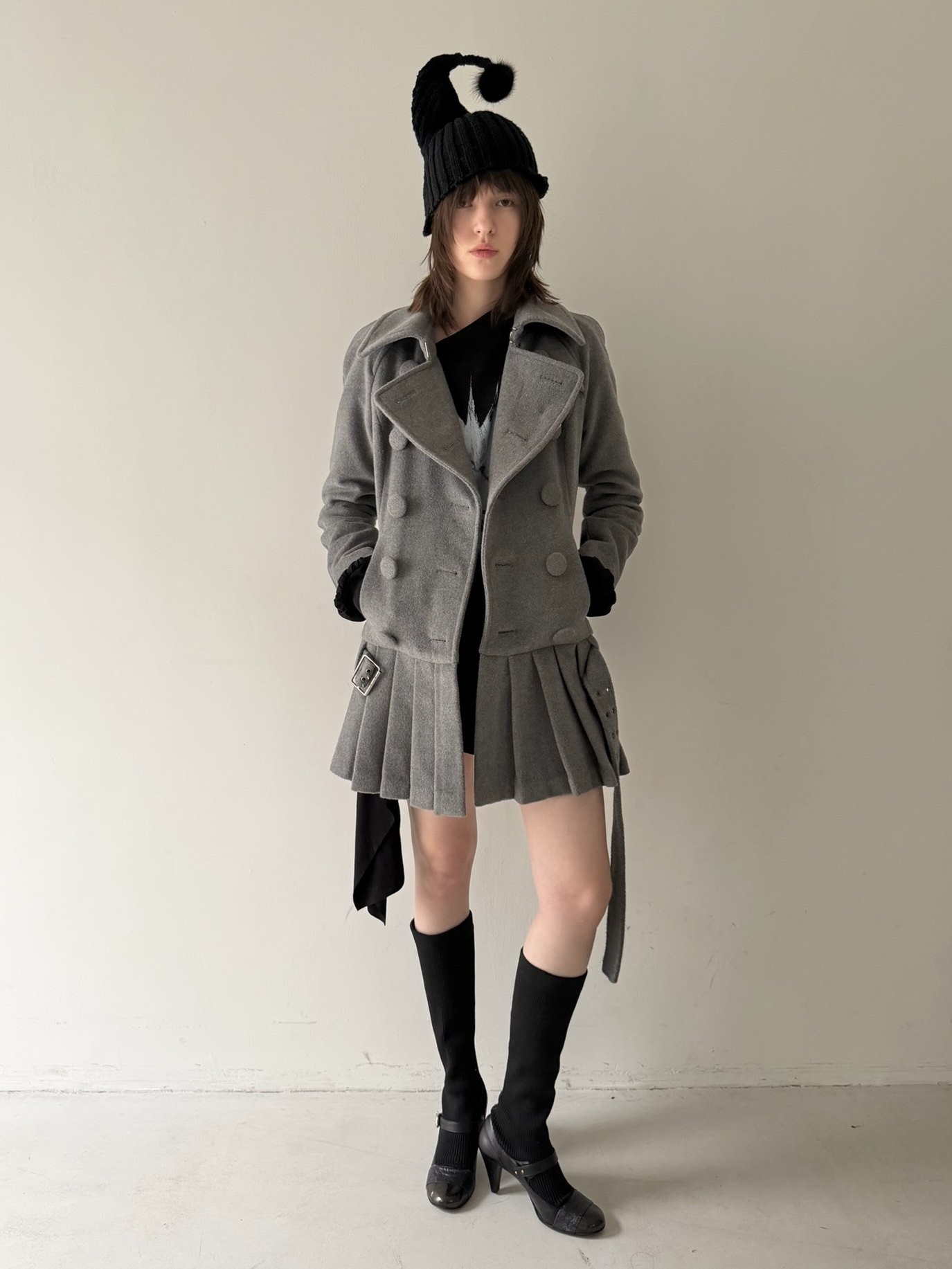 Gray Double-Breasted Pleated Hem Wool Coat